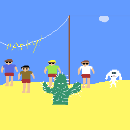 The program we usually use is called Aseprite. Each animation frame is adjusted by hand, without any tweening by the program. Limiting the time puts us under pressure to find simple ways to get an idea across.
